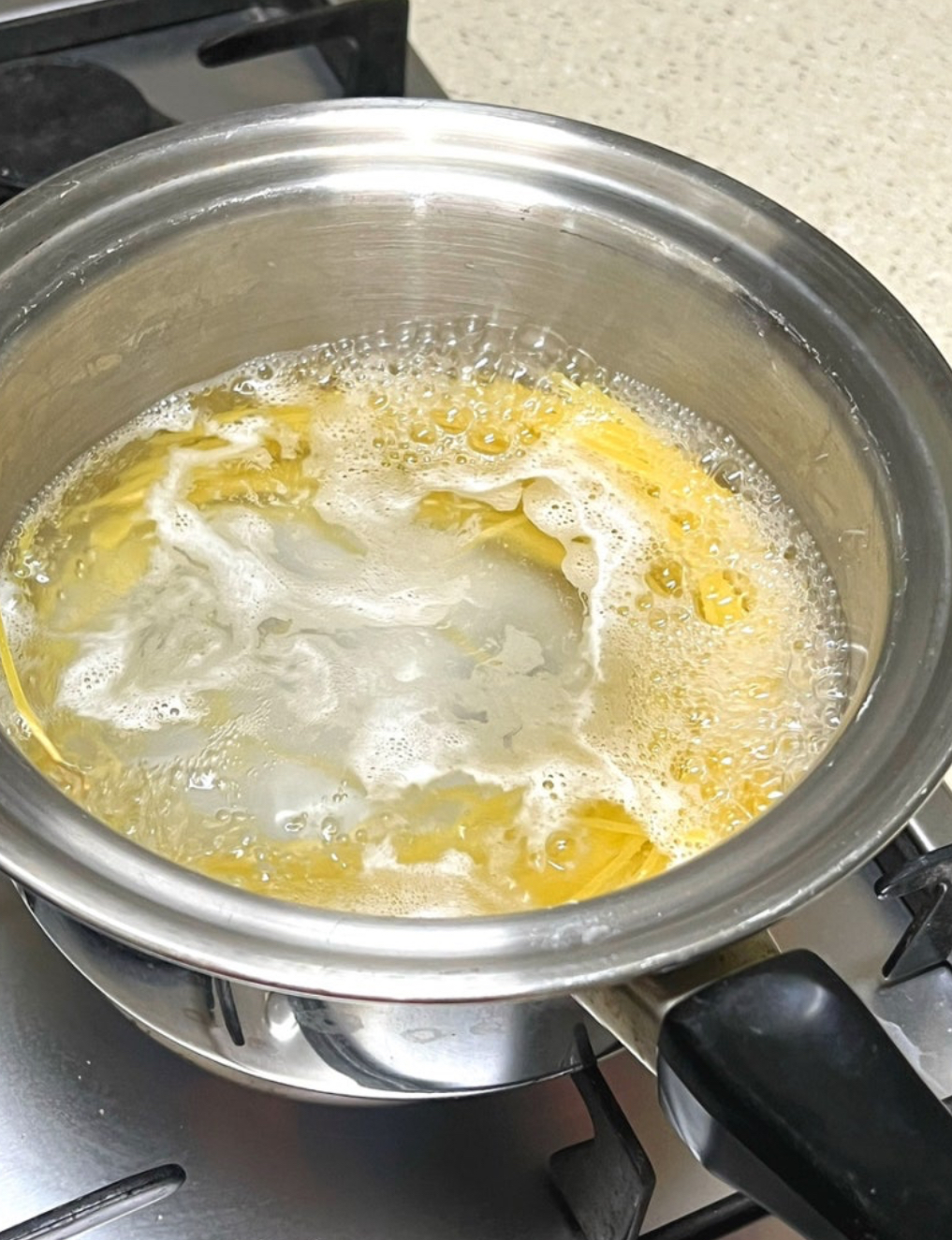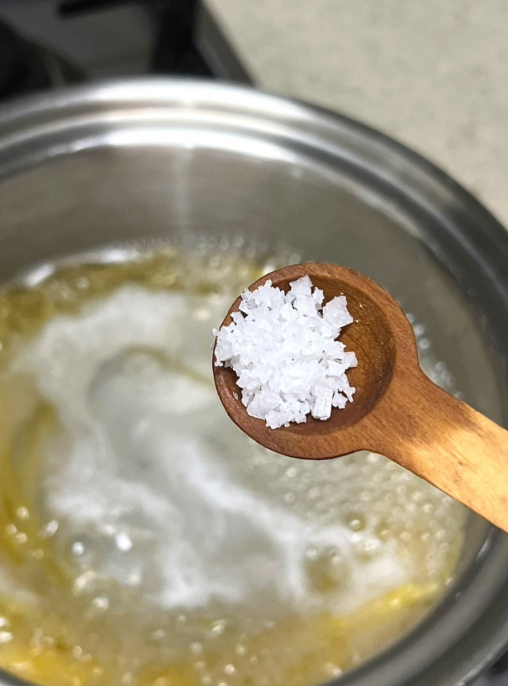 끓는 물에 면과 굵은소금을 같이 넣어주세요.