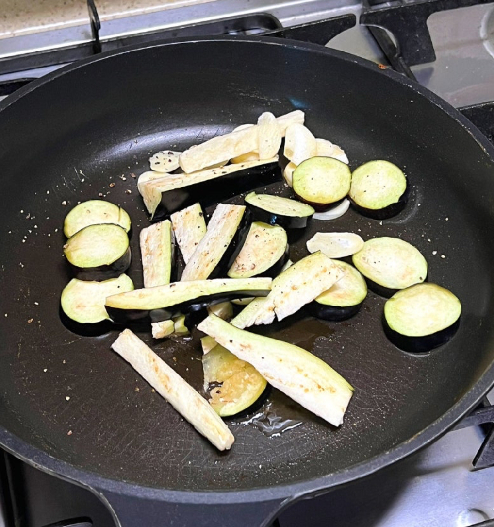 올리브유를 두른 팬에 마늘, 가지를 넣고